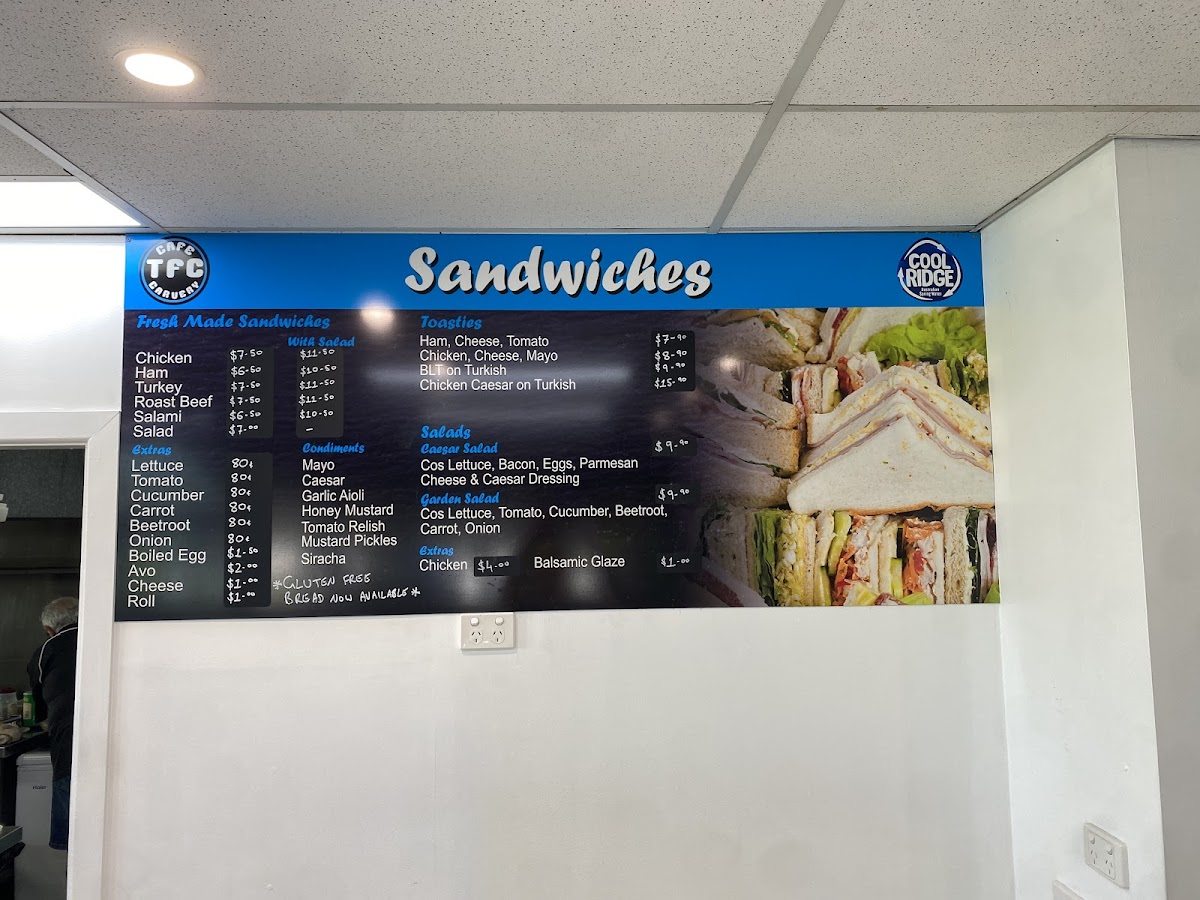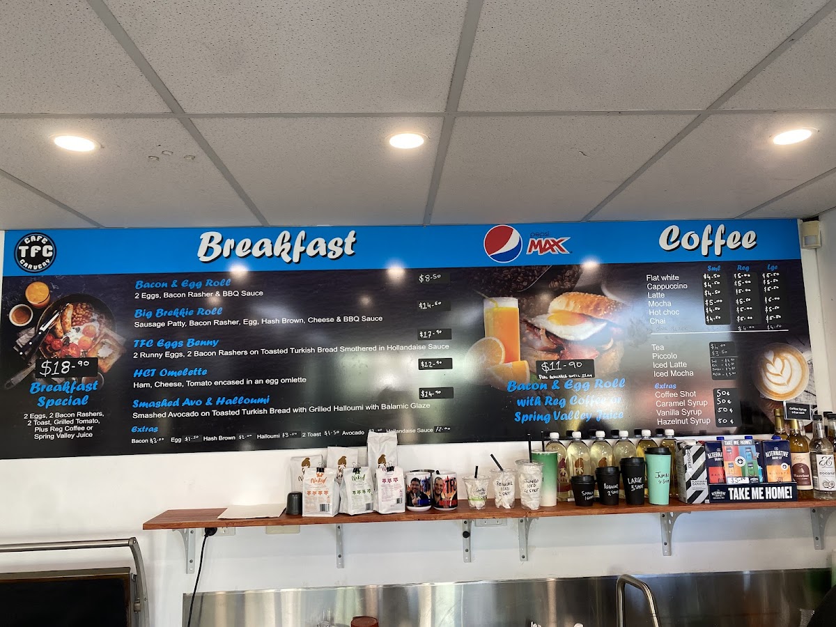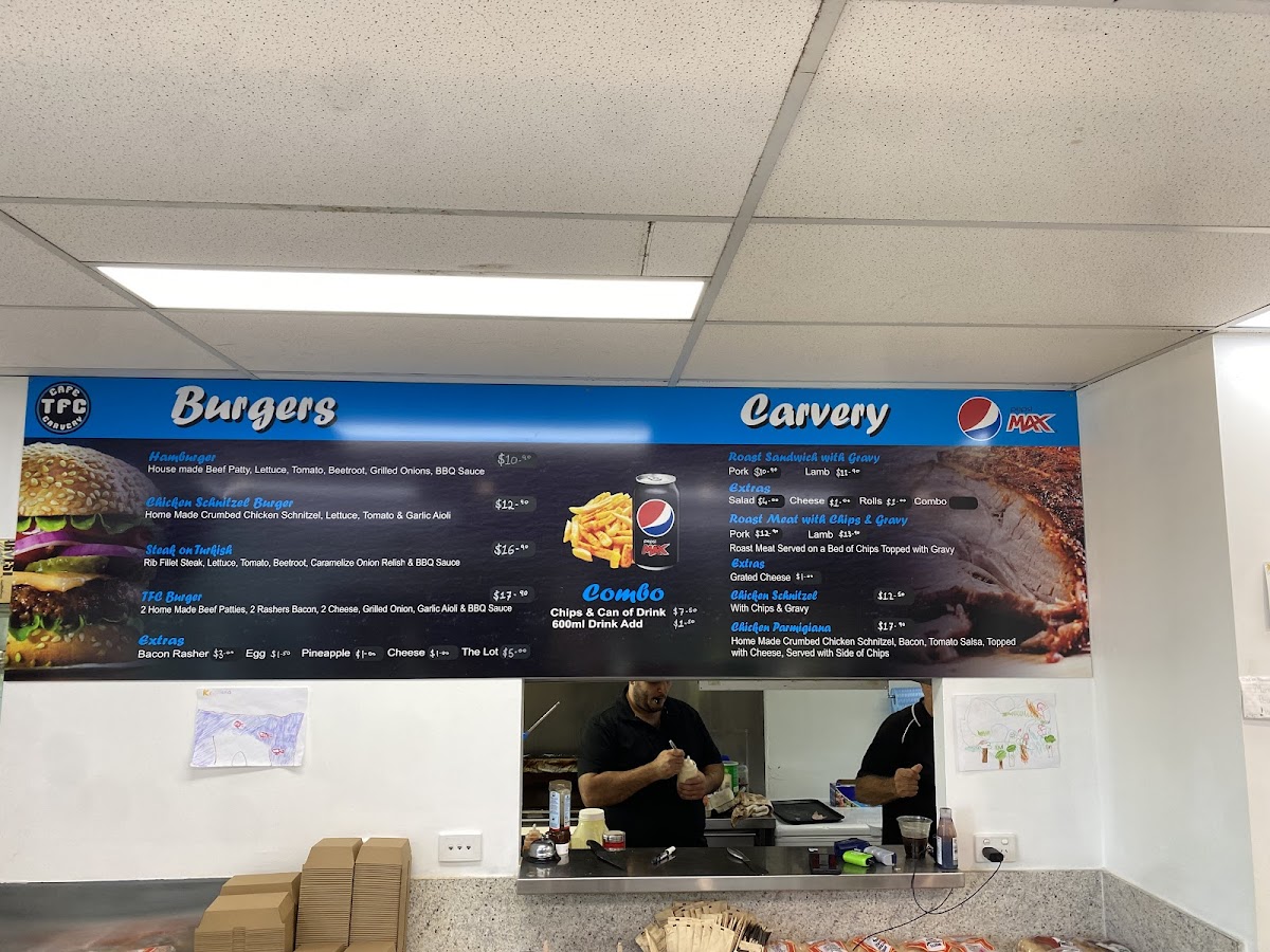 Burgers listed on the menu include classic Hamburger, Chicken Schnitzel Burger, Steak on Turkish bread, and the TFC Burger, with prices noted for some options.